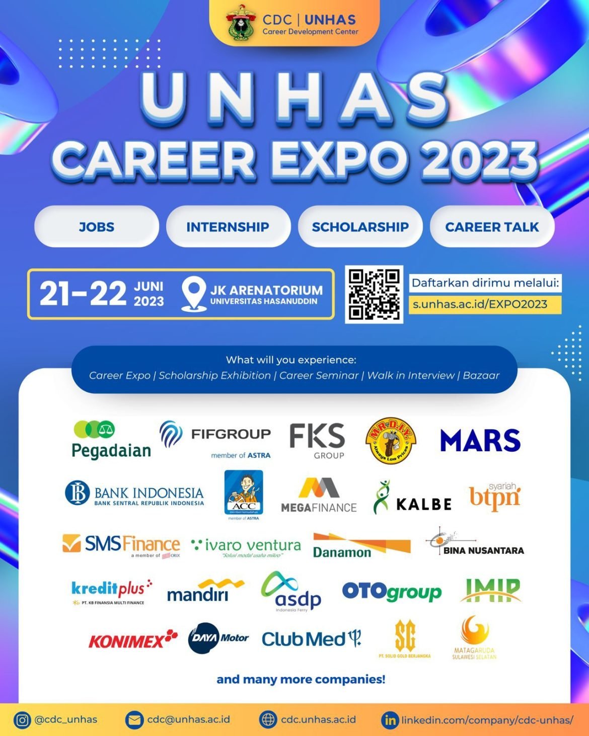 Universitas Hasanuddin (Unhas) melalui Career Development Center (CDC), Direktorat Kemahasiswaan dan Penyiapan Karir akan menggelar Unhas Career Expo pada 21-22 Juni 2023.