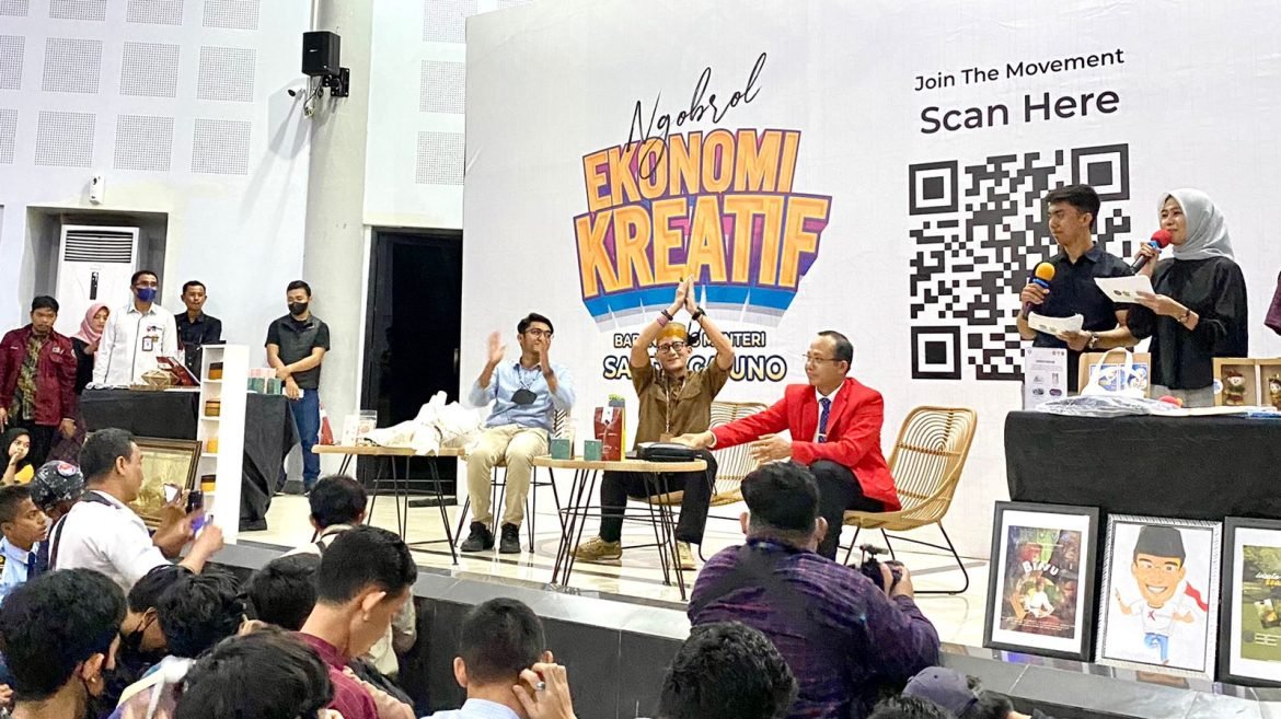 Kelaster-Makassar, Menteri Pariwisata dan Ekonomi Kreatif (Menparekraf) Republik Indonesia, Sandiaga Uno hadir di gedung Auditorium Prof. Amiruddin Universitas Hasanuddin bersama ratusan mahasiswa, siswa SMK, dan pelaku bisnis kreatif dalam rangka Ngobrol Bareng Pelaku Ekonomi Kreatif (NGOPREK) bareng mahasiswa Unhas dan para milenial (07/092022).