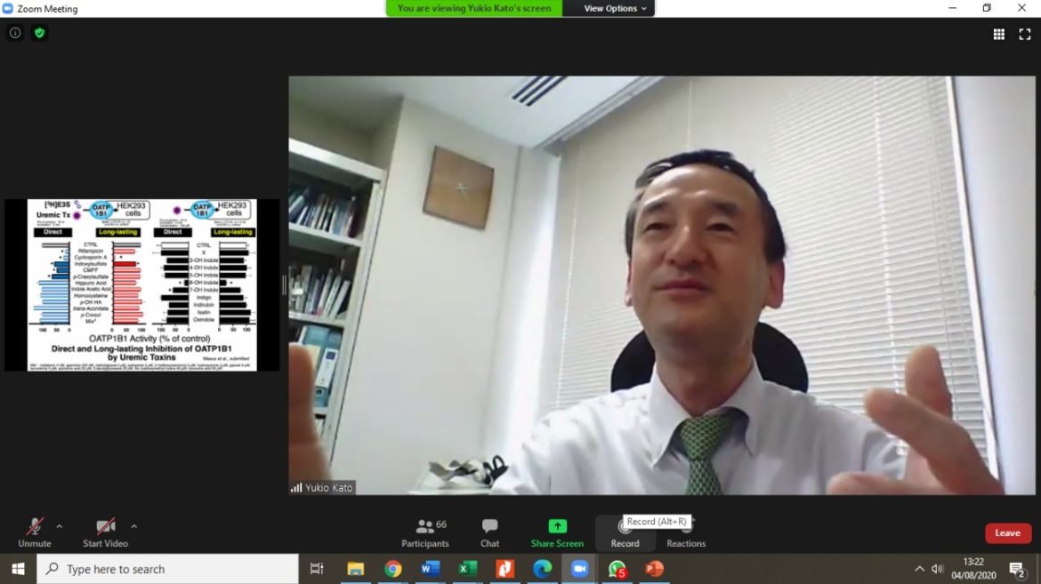 Prof. Kato juga menjelaskan tiga hasil penelitian yang berkaitan dengan topik penelitiannya. Salah satunya, penelitian tentang profil farmakokinetika metabolit aktif dari obat antikanker irinotecan, yaitu SN-38 pada pasien gagal ginjal.