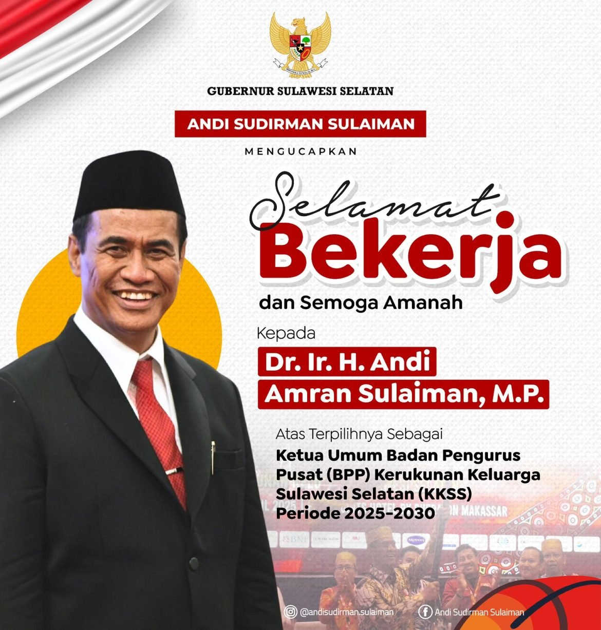 “Selamat dan sukses atas terpilihnya Bapak Andi Amran Sulaiman sebagai Ketua Umum KKSS. Semoga amanah ini membawa kemajuan dan keberkahan bagi seluruh masyarakat Sulawesi Selatan, insyaallah,” ujar Gubernur Andi Sudirman Sulaiman.