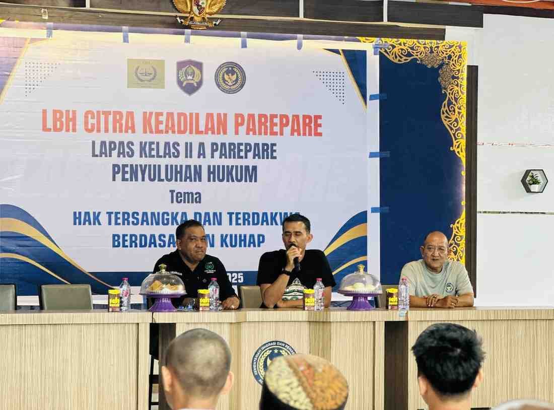 Materi penyuluhan disampaikan langsung oleh Ketua LBH Citra Keadilan Parepare, Saharuddin Abu, S.H., yang didampingi oleh Kepala Seksi Pembinaan Narapidana dan Kegiatan Kerja (Kasi Binadik) Lapas Parepare, Muchamad Zaenal Fanani, S.Sos., M.M. Dalam pemaparannya, pemateri menjelaskan hak-hak tersangka dan terdakwa sesuai KUHAP, seperti hak pendampingan hukum, hak mendapatkan perlakuan adil, serta hak memperoleh informasi yang jelas terkait proses hukum.