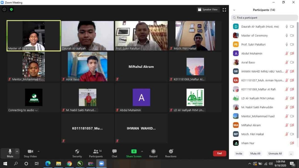 KELASTER. COM. Makassar – Lembaga Dakwah Al-‘Aafiyah FKM Unhas melaksanakan daurah pengurus pada hari sabtu, 19 September 2020. Kegiatan ini dilaksanakan Via Zoom Cloud Meeting dan dihadiri pengurus Muslim dan Muslimah.