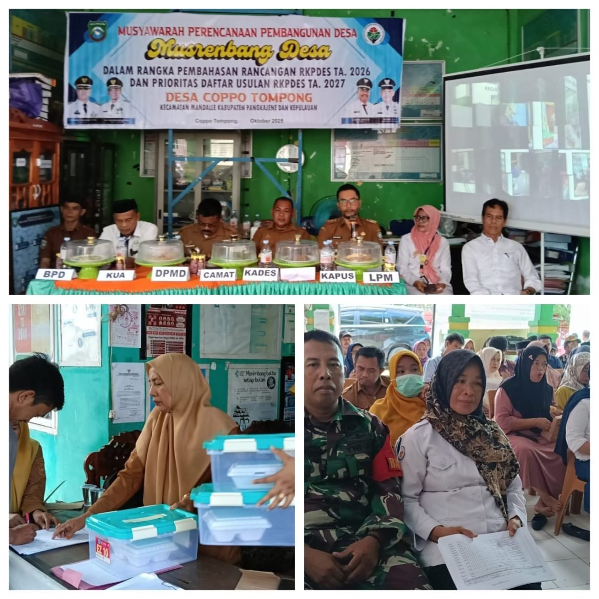 Kelaster.com Pangkep – Musyawarah Perencanaan Pembangunan (Musrenbang) Desa Dalam rangka pembahasan rancangan RKPDes TA 2026 dan Prioritas Daftar Usulan DU RKPDes TA 2027 berlangsung di ruang pertemuan Baruga Sayang Desa Coppo Tompong Kecamatan Mandalle Kabupaten Pangkajene dan Kepulauan pada Senin, 13 Oktober 2025.