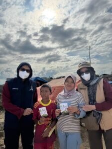 Kegiatan ini merupakan bagian dari pendistribusian logistik sekaligus edukasi kesehatan terkait pencegahan penyakit akibat nyamuk, khususnya Demam Berdarah Dengue (DBD) yang berisiko meningkat di lingkungan pengungsian. Sebanyak 40 kepala keluarga (KK) atau 140 jiwa menjadi penerima manfaat, terutama para penyintas yang tinggal di tenda-tenda pengungsian.