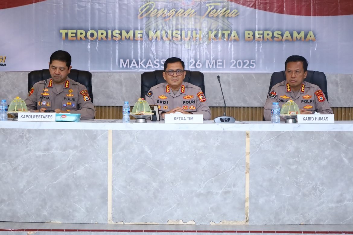 Kelaster.com Dalam rangka memperkuat upaya kontra radikalisasi dan meningkatkan kewaspadaan terhadap ancaman terorisme, Polda Sulawesi Selatan menggelar kegiatan Focus Group Discussion (FGD) dengan tema “Terorisme Musuh Kita Bersama”. Kegiatan ini berlangsung di Polrestabes Makassar dan dihadiri berbagai elemen masyarakat, mulai dari tokoh agama, tokoh masyarakat, tokoh pemuda, hingga mahasiswa, Senin (26/05/2025)