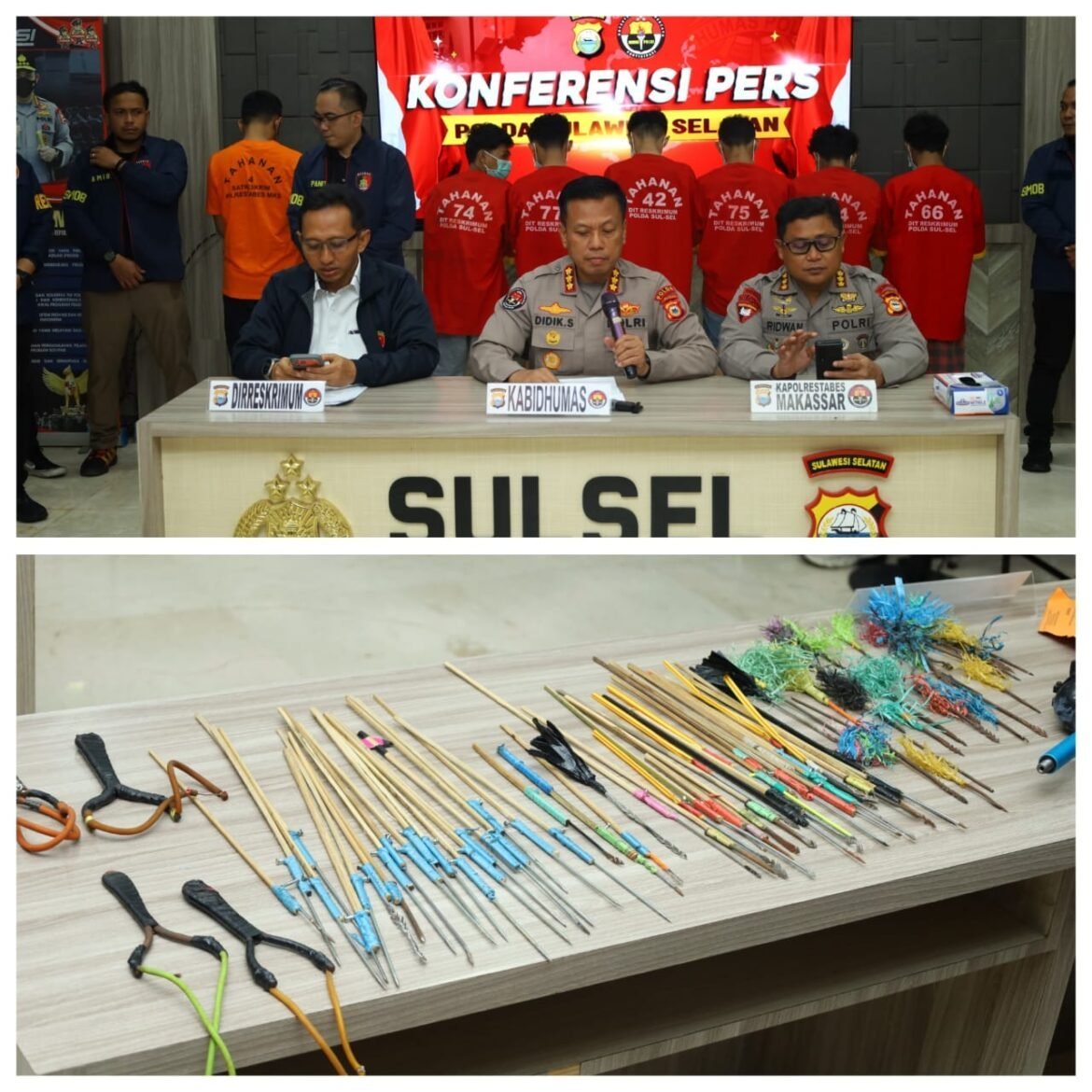 Press release dipimpin oleh Kabid Humas Polda Sulsel Kombes Pol. Didik Supranoto, S.I.K., M.H., didampingi Dirreskrimum Polda Sulsel Kombes Pol. Setiadi Sulaksono, S.I.K., M.H., serta Plt Kapolrestabes Makassar Kombes Pol. Muhammad Ridwan, S.I.K., M.H.