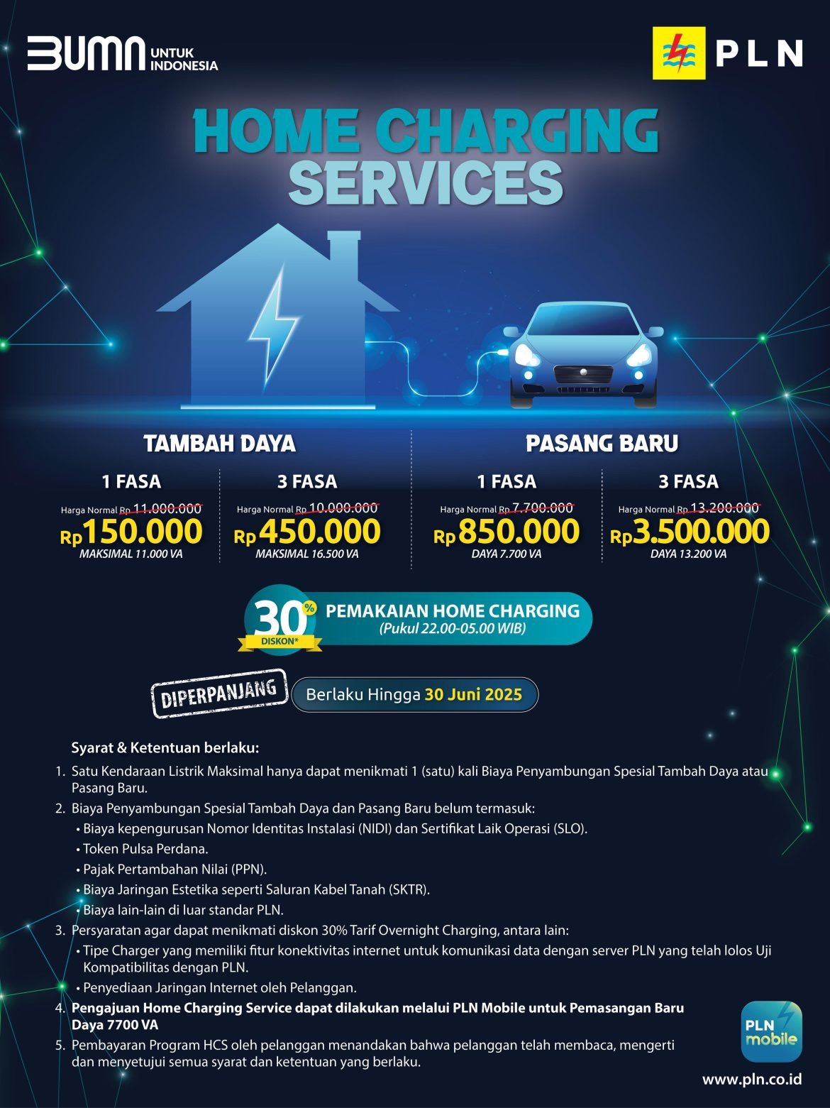 “Promo Home Charging Services diperpanjang hingga 30 Juni 2025. Ini merupakan bagian dari komitmen PLN dalam mendukung transisi energi bersih dan memperluas penggunaan kendaraan listrik, ujar Avif.