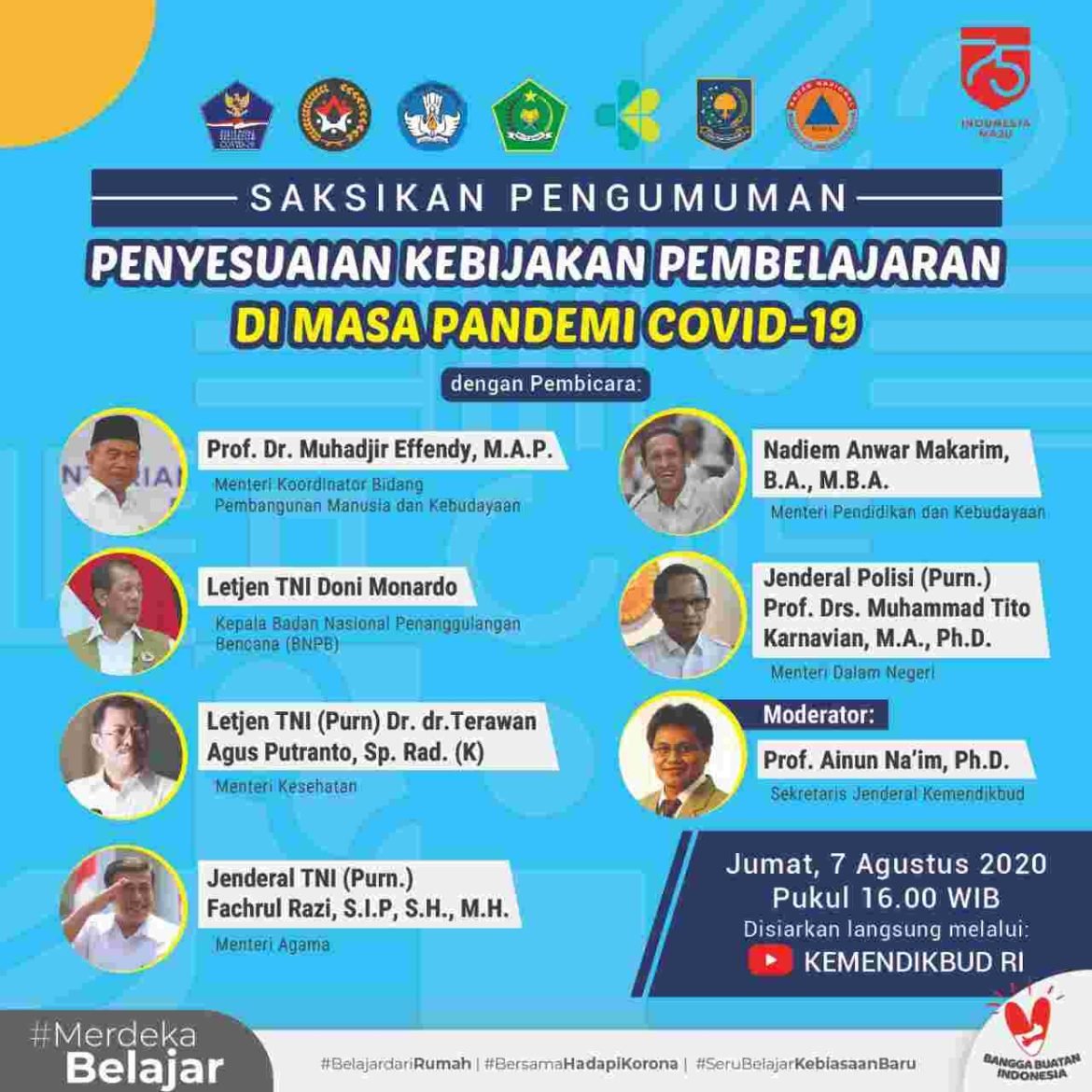 Hal itu terungkap pada webinar pengumuman penyesuaian kebijakan pembelajaran di masa pandemi Covid-19, yang digelar secara virtual melalui aplikasi zoom meeting, dan disiarkan langsung dari Kementerian Pendidikan dan Kebudayaan, Jumat (7/8/2020).