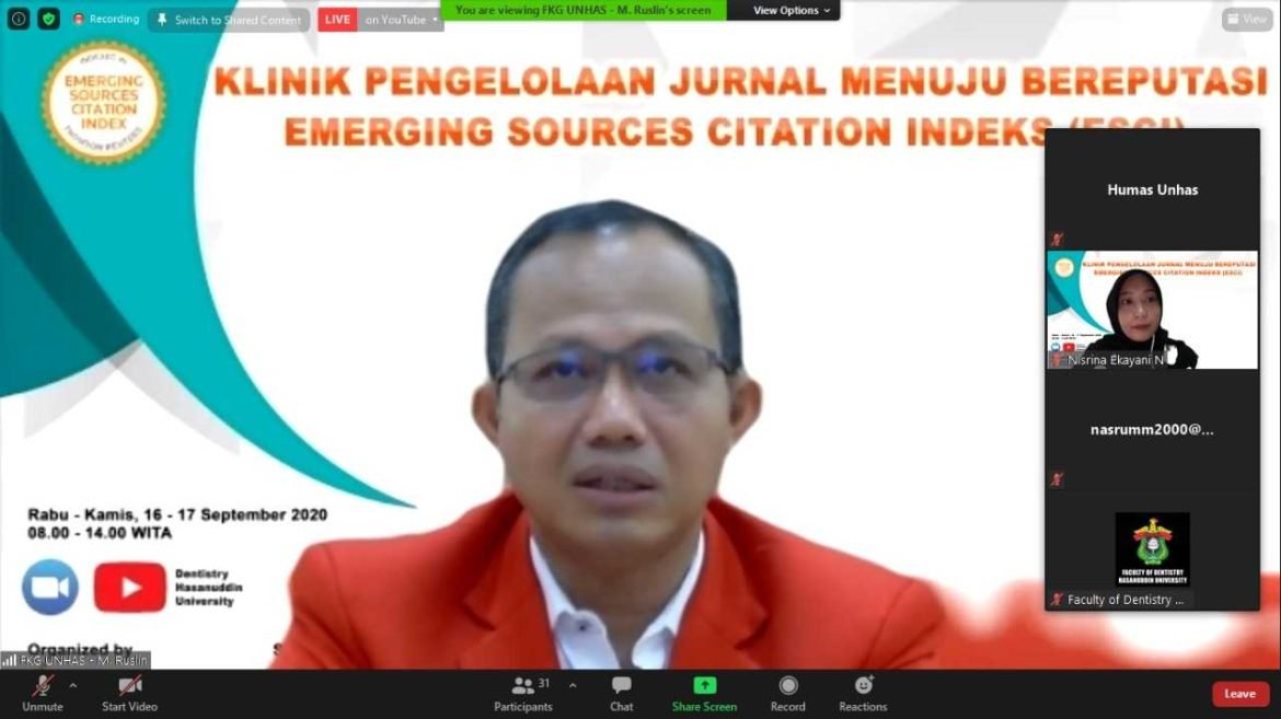 KELASTER.COM, MAKASSAR – Universitas Hasanuddin melalui Klinik Pengelolaan Jurnal Fakultas Kedokteran Gigi (FKG) menyelenggarakan webinar seri dua bertajuk “Klinik Pengelolaan Jurnal Menuju Bereputasi Emerging Sources Citation Indeks (ESCI)”.