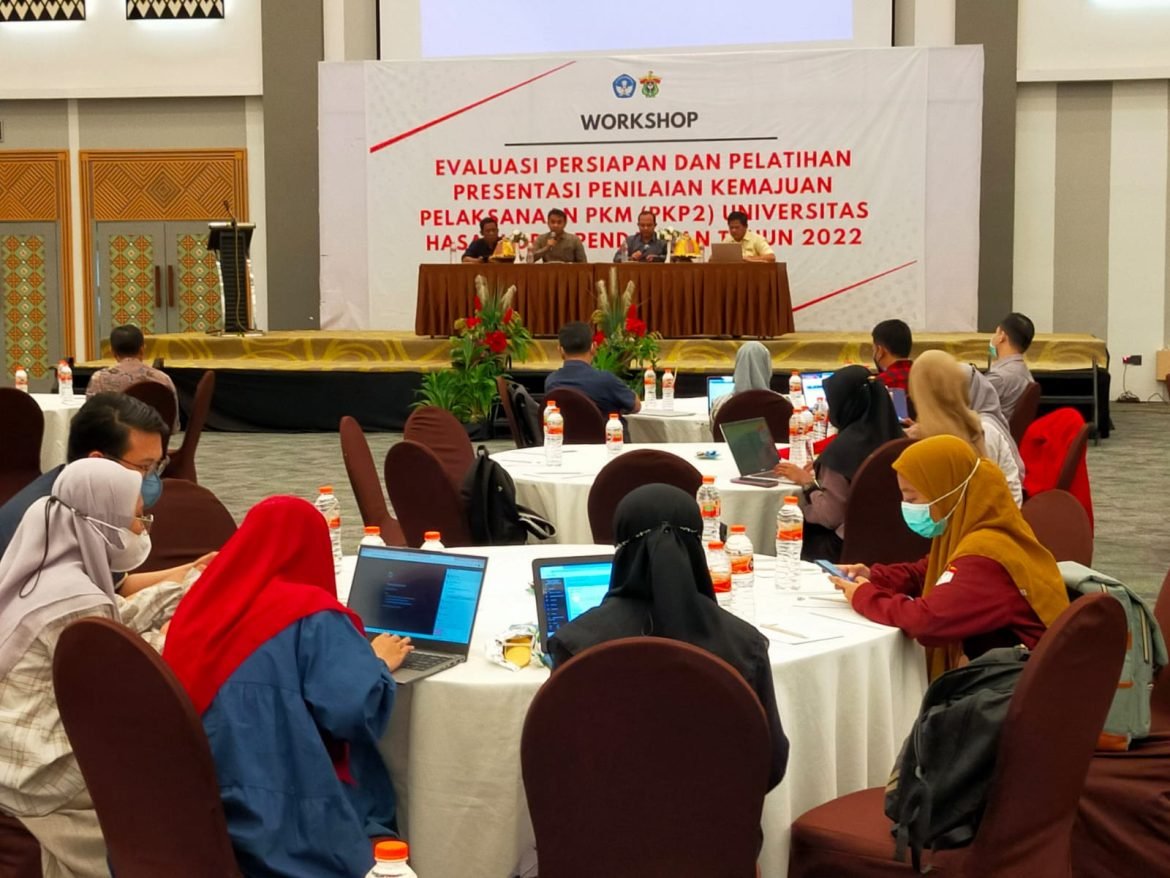 Workshop Evaluasi Persiapan dan Pelatihan Presentasi Penilaian Kemajuan Pelaksanaan PKM (PKP2) Universitas Hasanuddin tahun Pendanaan 2022 kembali dilaksanakan hari Kamis (08/09) di hotel Maxone Makassar, Sulawesi Selatan. Wakil Rektor Bidang Akademik dan Kemahasiswaan, Prof. drg. Muhammad Ruslin, M.Kes, Ph.D, SpBM(K) didampingi oleh Direktur Alumni dan Penyiapan Karir, Abdullah Sanusi, SE., MBA, Ph.D turut hadir dalam pembukaan kegiatan ini.